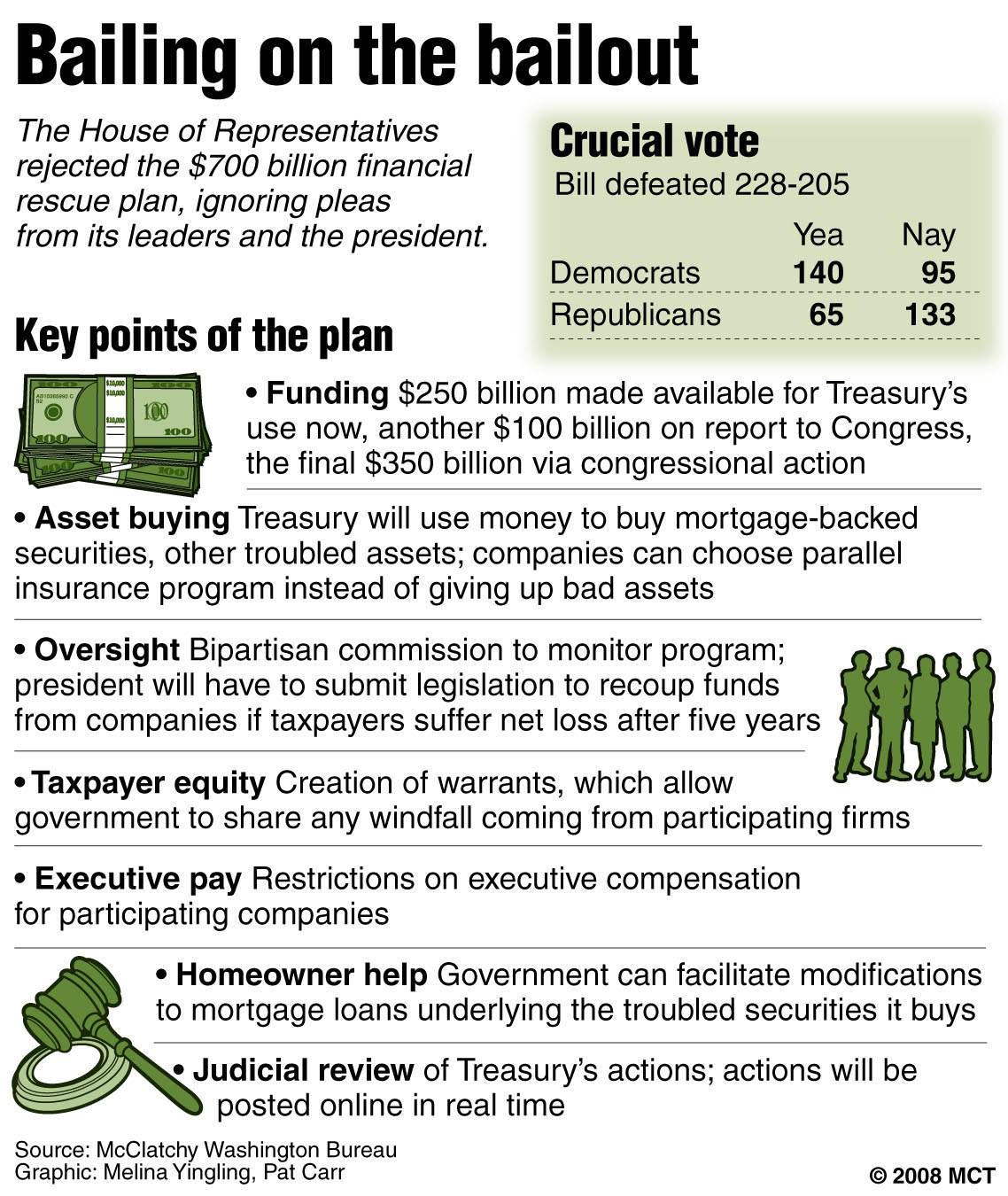 The House of Representatives rejected the proposed $700 billion plan to bail out the U.S. economy late Monday afternoon. The emergency rescue package, which aimed to buy bad mortgages to help stabilize the economy, failed by 23 votes, sending the Wall Street Stock Exchange plummeting before the vote was even complete.