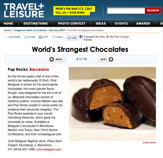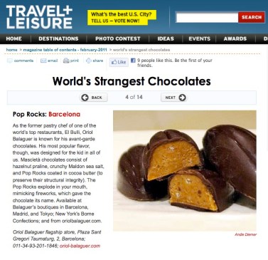 Way back in freezing cold February, I made the trip from Travel + Leisure’s 6th Avenue office to shoot a little bit of Barcelona, Spain at Borne Confections on Park Avenue. I was tasked with shooting Oriol Balaguer’s Mascletà chocolates for Travel + Leisure’s World’s Strangest Chocolates slideshow. While some of the “strange” chocolates on the shoot list ranged from Shiitake Mushroom to Tobacco to Pig’s Blood, the Mascletà was quite mainstream — it contained hazelnut praline, crunchy Maldon sea salt and Pop Rocks (!) coated in cocoa butter.