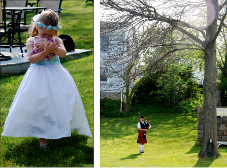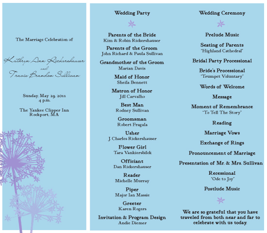 On Memorial Day weekend my boyfriend’s sister and her fiancé officially tied the knot in a beautiful and intimate ceremony in Rockport, Massachusetts. I was lucky enough for them to ask me to design their wedding invitations, RSVP cards and programs for the big day, and we worked together to ensure I created something they both loved. While out shopping with the bride-to-be, Katie, for shoes one day, she showed me the colors of her bridesmaids dresses. It was a discontinued color — Capri, from David’s Bridal — but I was able to get a screen shot of it from their site before they updated it and used it as the base color of all three items I designed to have a consistent theme tie them all together.