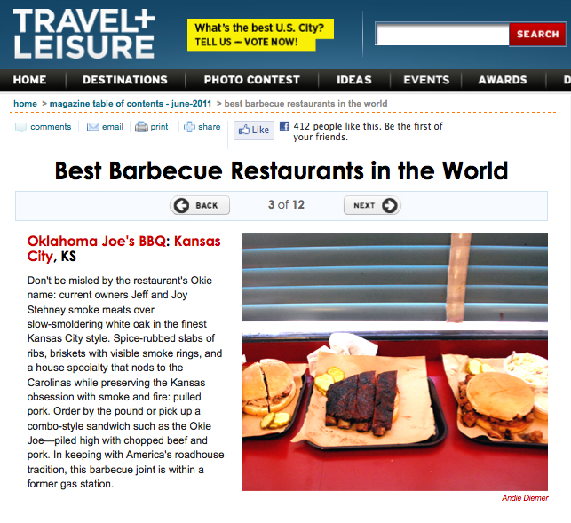 Just this week one of my photographs of Oklahoma Joe’s BBQ (which ironically enough is actually located in Missouri) was featured in Travel + Leisure’s Best Barbecue Restaurants in the World package. It was one of those rare times a T+L shoot list floats by and not only have I actually visited one of the places, but have also photographed it. While I dug through the files on my laptop to unearth the images, it triggered major positive memories of exactly a year ago, when I originally visited the joint.