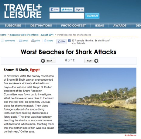 one: During my senior year of college I was asked to participate in a research trip to Sharm el-Sheikh, Egypt to track trends and forecasts for the future of the Internet at the United Nation’s Internet Governance Forum. I went as a student researcher with Imagining the Internet and enjoyed a week in a beachy paradise located on the Sinai Peninsula and jutting out into the Red Sea. I can easily remember the beautiful swim I took in the Red Sea. And I also remember how I felt when I saw Sharm on the shoot list for this: Worst Beaches for Shark Attacks. Sharm’s No. 8.