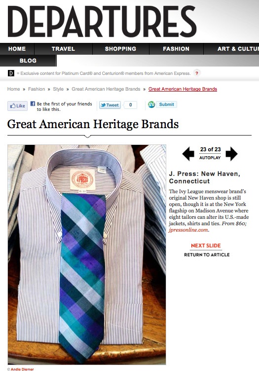 two: American Express Publishing Corporation, the parent of Food & Wine, Travel + Leisure, is also the owner of few other titles, including Departures. Departures is a luxury lifestyle publication only available to American Express Black Card members. A few weeks ago they started the post-production process to expand a story from the July/August issue about Great American Heritage Brands. Not every brand in the print story had a corresponding photo tied to it for the slideshow, so we conducted image research on a few places. Luckily J.Press is located in New York City, so I was able to walk a few blocks from work and shoot it for the feature. It was my birthday, so it was a nice treat to get out of the office and have a chance to create.