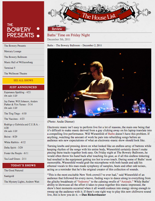 On Dec. 2, Baths played at The Bowery Ballroom in the Bowery. My boyfriend wrote the review for the electronic pop band led by Will Wiesenfeld as I snapped away to capture the show. It was an intimate setting, and with just one person providing all of the music from their laptop and few instruments, it was a bit of a challenge to make aesthetically appealing through the lens. The light was interesting, though not ideal, and there were dozens of small candles placed around the entire stage that provided a lot of depth to the setting. Baths was great, the crowd was relaxed and everyone was grooving along as if this was their last chance to dance. See some additional shots below:
