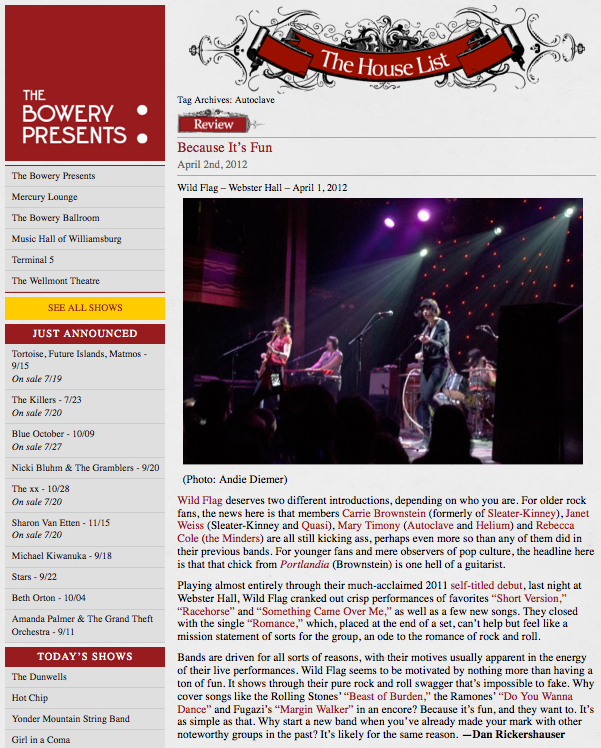 Have you seen Portlandia? Then you probably already know Carrie Brownstein, the lead singer of Wild Flag. Yes, she is in a band, and yes, she is totally legit. Dan was tapped to review Wild Flag at The Bowery Ballroom and asked me to come along to document the show. The show was super high-energy and Carrie shredded on the guitar. Sadly, there were no birds in site.