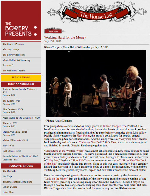 When I found out that Dan was asked to review Blitzen Trapper for The House List, I begged him to let me tag along to shoot it. We’ve both loved the band (and especially their song “Furr”) since they first got together, and it had always been a dream to see them in person. Their act alone topped out at close to two hours and covered every song I was hoping to hear, so I can officially cross Blitzen Trapper off my bucket list. Check out some additional photos below that didn’t make it on Bowery Presents: