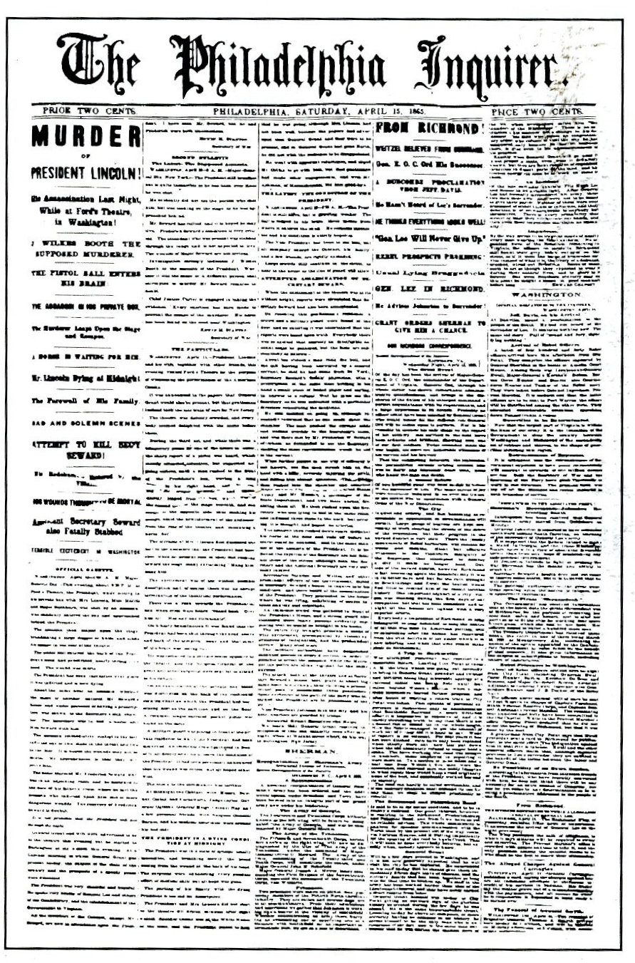 This is a 1865 edition accounting the assassination of President Lincoln. It has 15 headline decks and has a vertical text format, so when a story hits the bottom on a column it jumps to the top of the next one (Harrower, 4). This was typical of newspapers throughout the 19th century, since they all basically looked the same and involved little or no visuals. “During the Civil War, papers began devoting more space to headline display, stacking vertical layers of deckers or decks in a dizzying variety of typefaces” (Harrower, 4). Harrower gave the example of how The Chicago Tribune used 15 decks on the front page to report on teh great fire of 1871. The element of art remained space until the early 1900s, even though the first newspaper photo was published in 1880 (Harrower, 4).