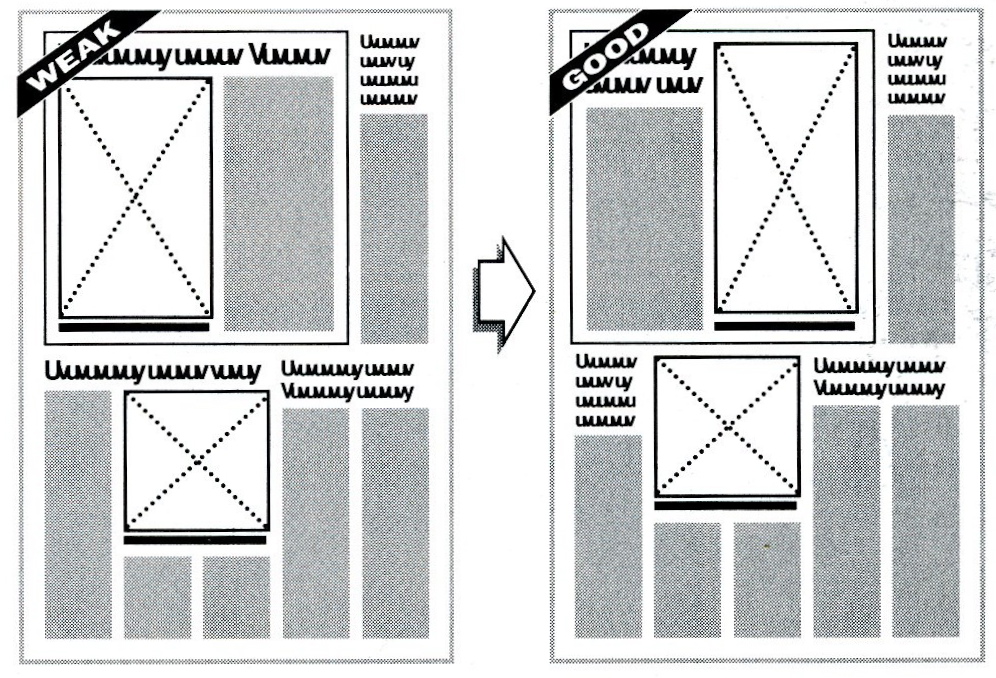 Balance and scatter art in a non-confusing way. With small photo placement there is no confusion and the page is more balanced when art is spread (Harrower, 77). Be cautious with butting headlines since it can make a layout confusing. By separating stories it’s a much cleaner layout. The raw wrap on the second layout allows for readers to have an easier time reading stories that may be run side by side (Harrower, 77).